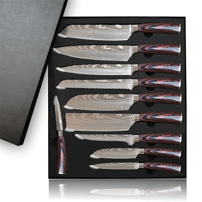 🔪【MULTIPURPOSE】 The 10 PCS kitchen knife boxed set includes 8″ Chef Knife, 8″ Slicer Knife, 5″ Utility Knife, 8″ Bread Knife, 7.5″ Cleaver Knife, 7″ Santoku Knife, 5″ Santoku Knife, 7″ Cleaver Knife, 6″ Boning Knife, and 3.5″ Paring Knife. The curve of the blade is gentle aides in easy precise cutting. Great for mincing, slicing, and dicing fruit, meat, fish, and vegetables in the kitchen because of excellent performance.