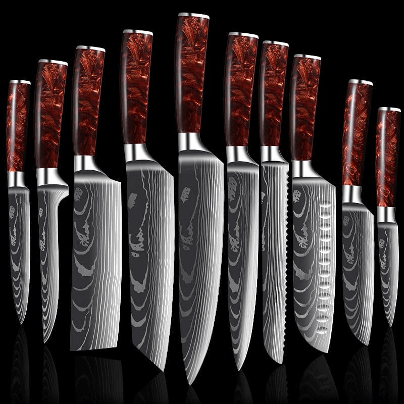 🔪【MULTIPURPOSE】 The 11 PCS kitchen knife boxed set includes 8″ Chef Knife, 8″ Utility Knife, 8″ Bread Knife, 7.5″ Kiritsuke Knife, 7″ Cleaver Knife, 7″ Santoku Knife, 5″ Santoku Knife, 5.5″ Boning Knife, 5″ Utility Knife, 5″ Steak Knife and 3.5″ Paring Knife. The curve of the blade is gentle aides in easy precise cutting. Great for mincing, slicing, and dicing fruit, meat, fish, and vegetables in the kitchen because of excellent performance.