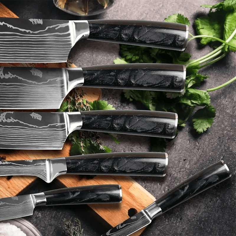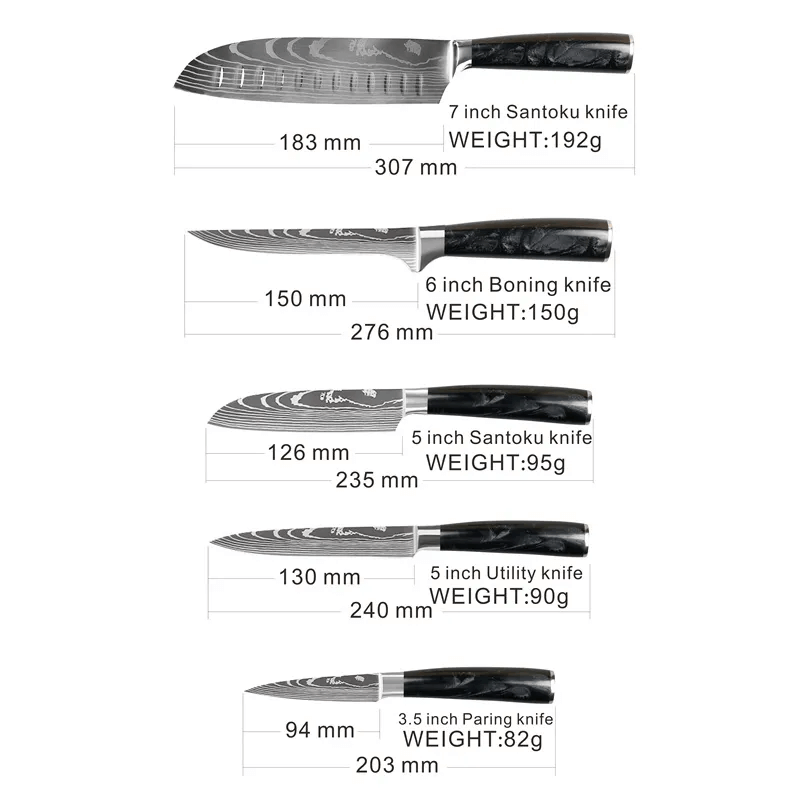 🔪【INGENIOUS APPEARANCE & DESIGN】MOFUN kitchen knives set has a unique outlook compared with the other normal knives set. Its design combines a western chef knife and a Japanese knife. The waved laser-etched pattern and original wooden texture make the knife shiny and stylish. It can make simple cooking become a creation of beauty.
