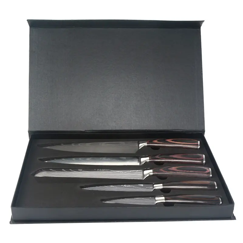 🔪【MULTIPURPOSE】 The 5 PCS kitchen knife boxed set includes 8″ Chef Knife, 8″ Bread Knife, 8″ Utility, 5″ Utility and 3.5″ Paring Knife. The curve of the blade is gentle aides in easy precise cutting. Great for mincing, slicing, and dicing fruit, meat, fish, and vegetables in the kitchen because of excellent performance.